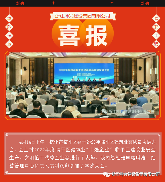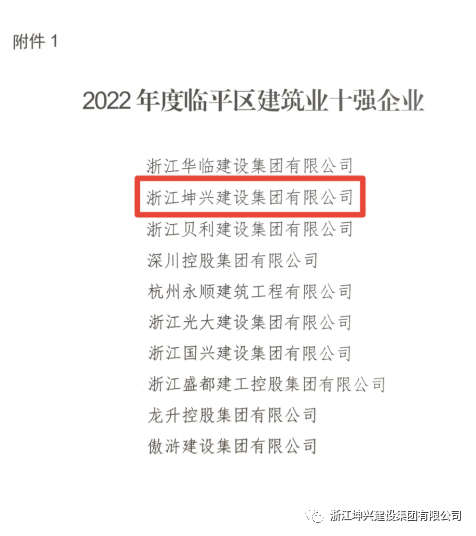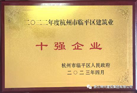 浙江坤兴建设集团有限公司荣膺2022年度杭州市临平区建筑业"十强企业"