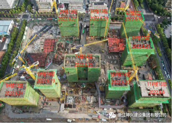 杭政储出【2021】52号地块项目(晓月映翠)整体进度较快,2022年2月23日正式开始施工,3月8日正式开始出土,4月30日首开全部到达±0.00,6月29日首开全部到达销售楼层,9月13日二开全部到达销售楼层,10月27日首开楼栋基础验收完成,10月30日全部楼栋封顶大吉,11月4日首开楼栋主体验收完成,12月17日3#楼首栋外架开始拆除。